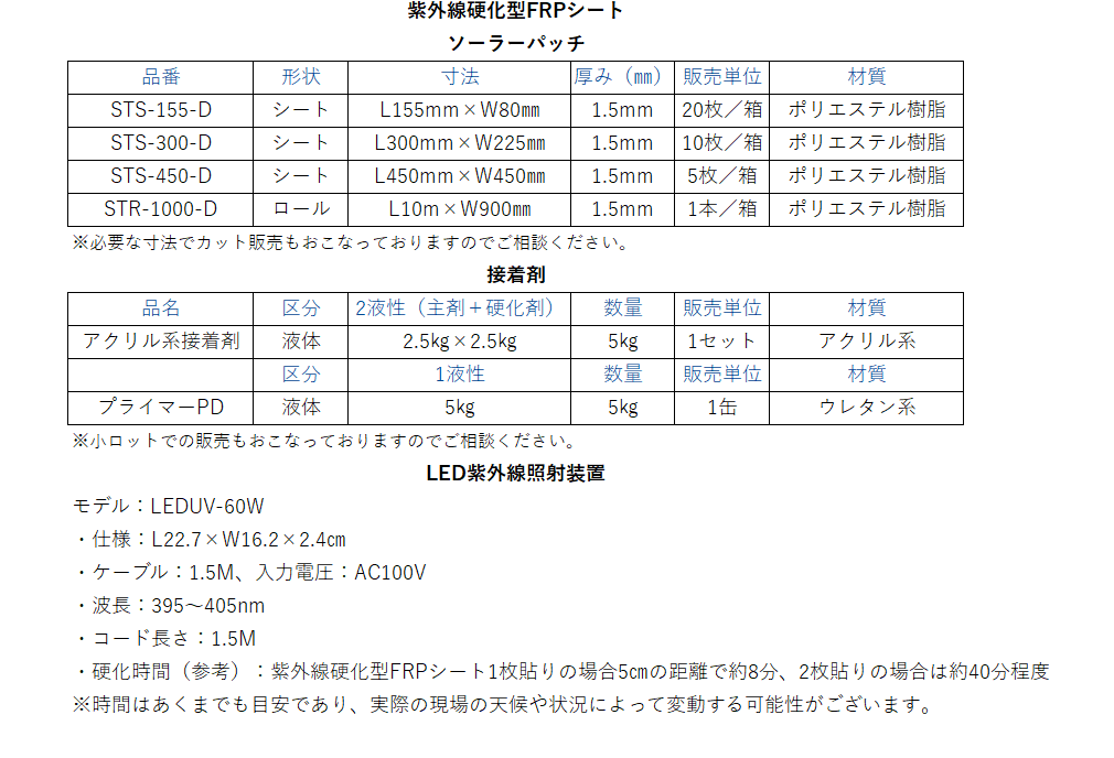 - 紫外線硬化型FRPシート加工:補修部の大きさに合わせてソーラーパッチを切ります。あらかじめ当社にてサイズを合わせたものを納入することも可能です。